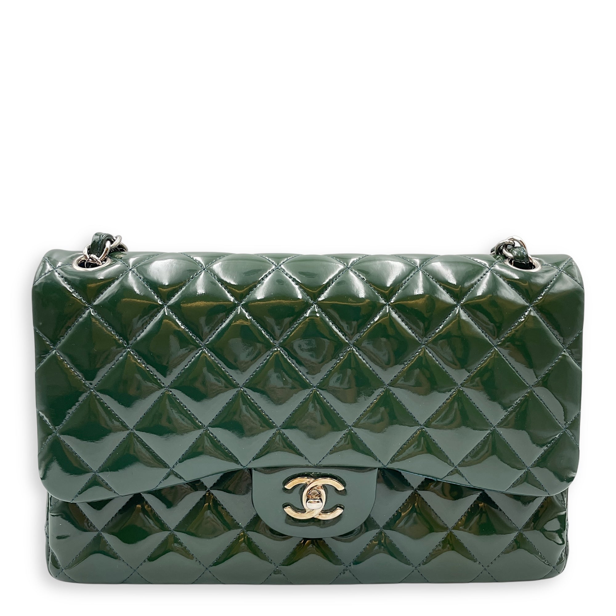 Classic Double Flap Jumbo Green Shoulder Bag in Patent Leather, Silver hardware