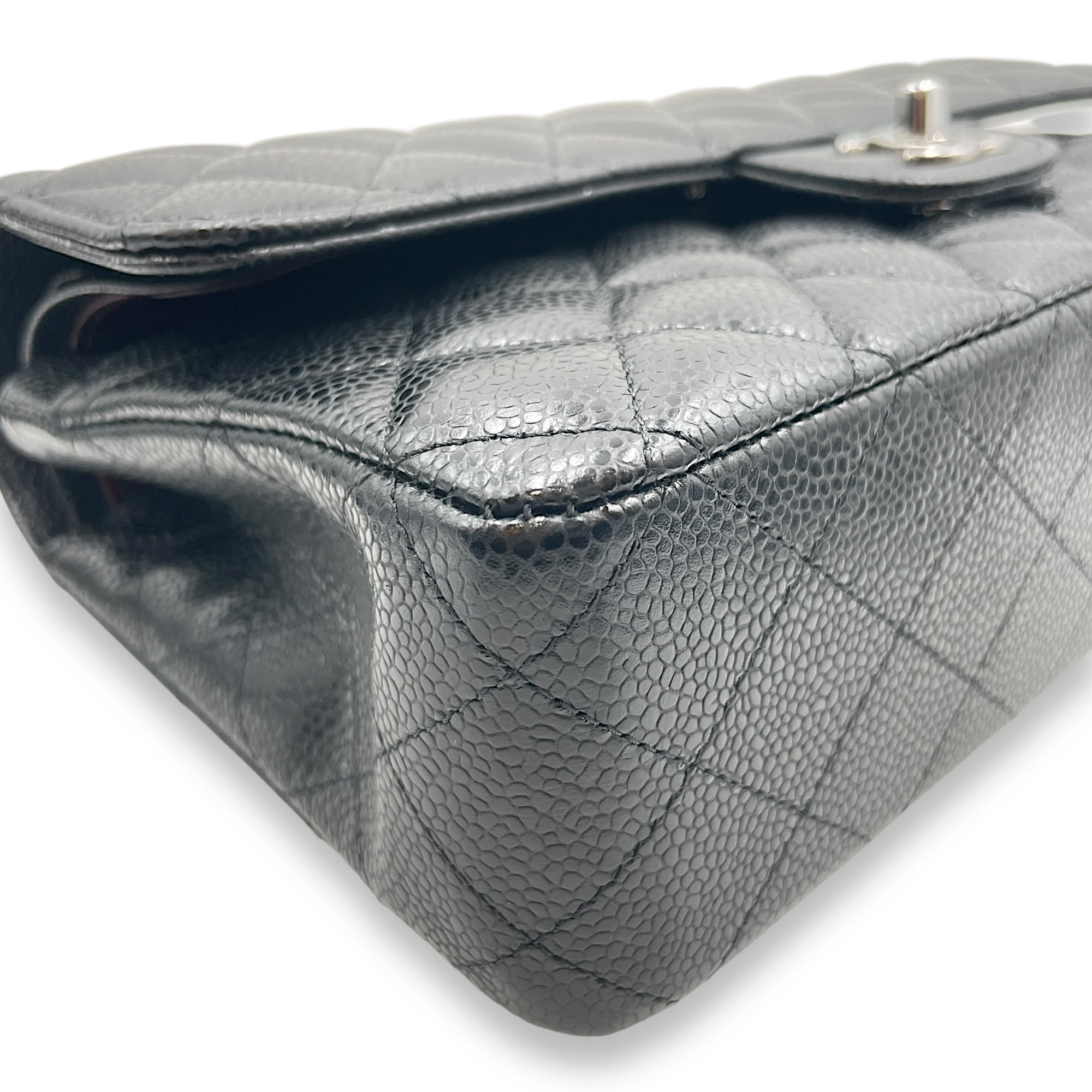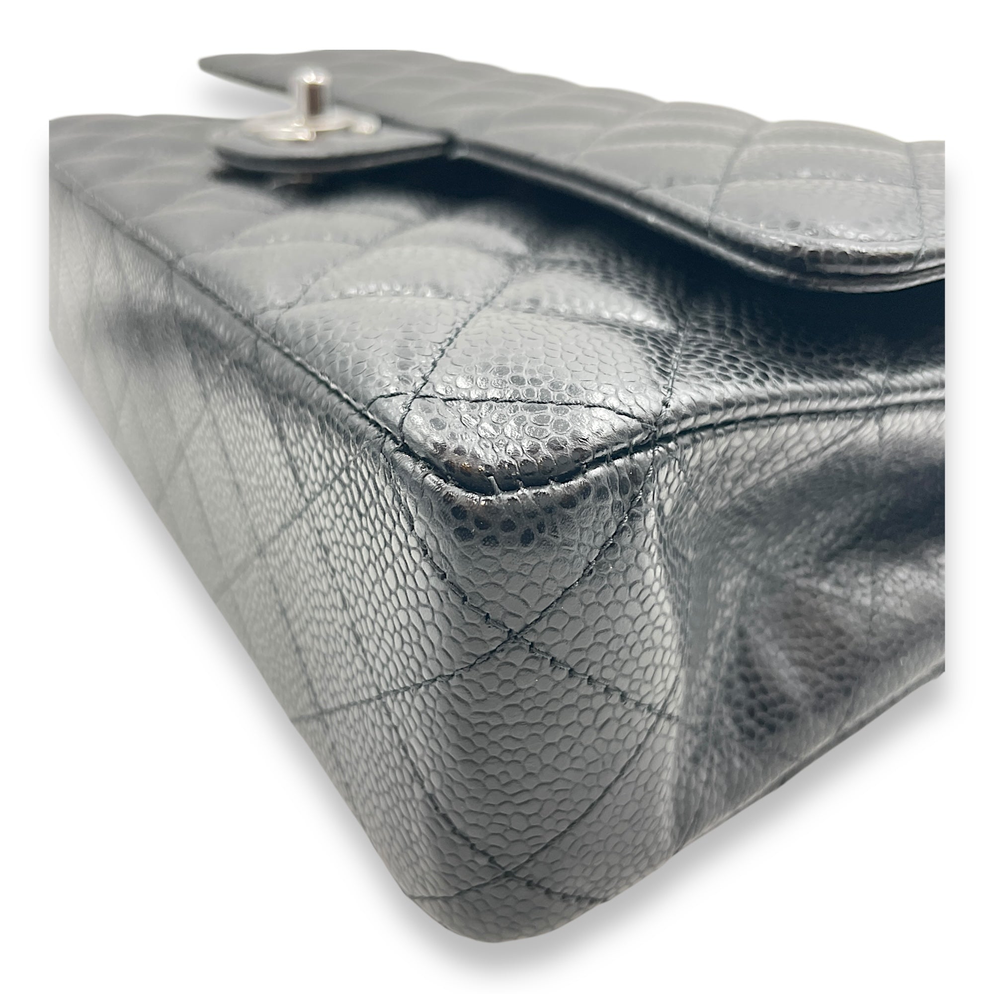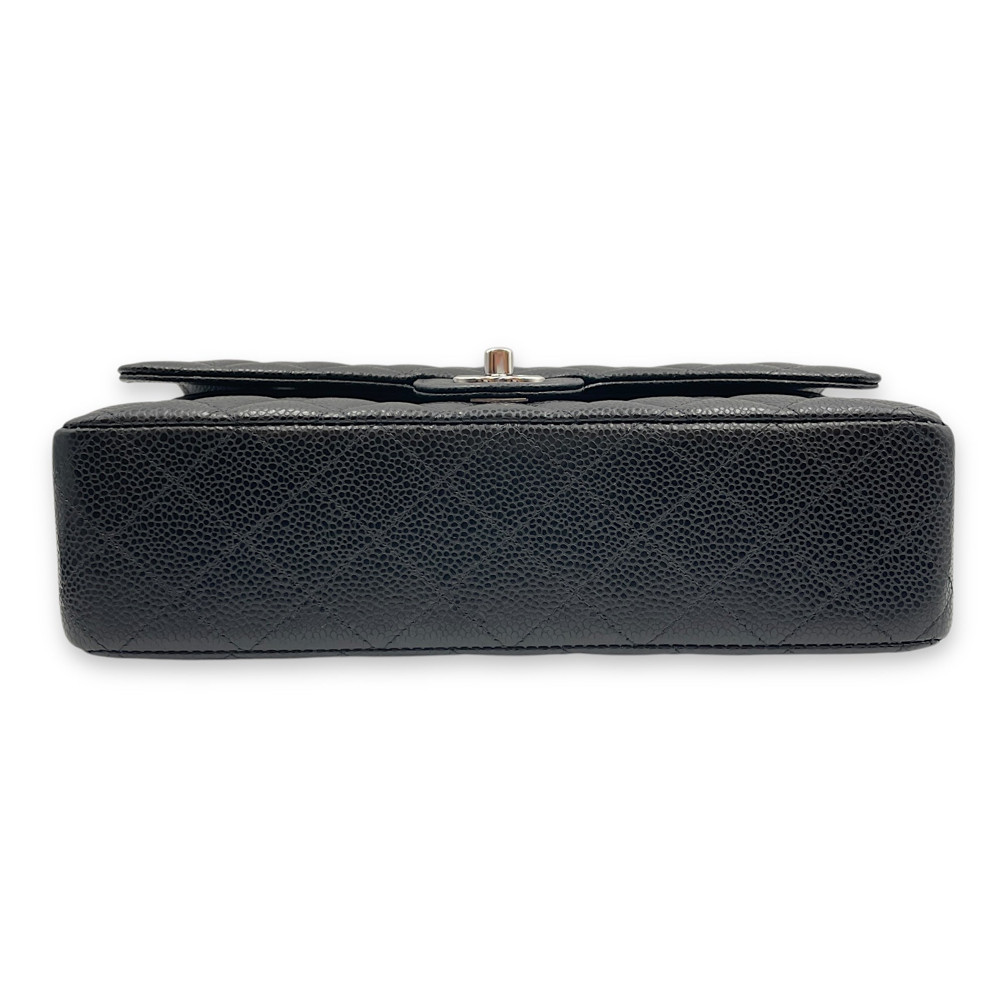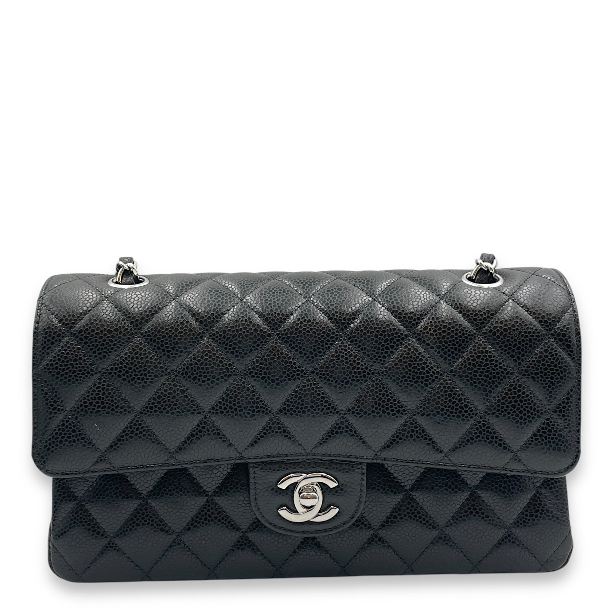 Quilted CC Classic Medium Black Double Flap Bag in Caviar Leather, Silver hardware